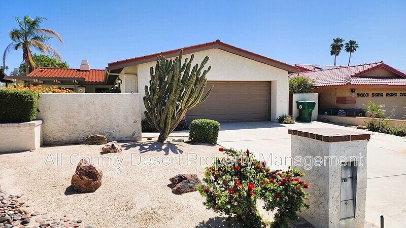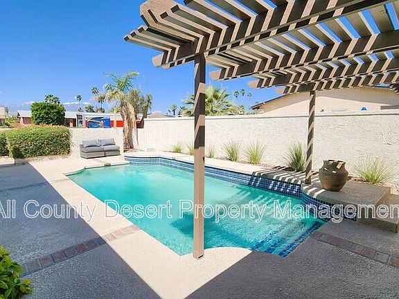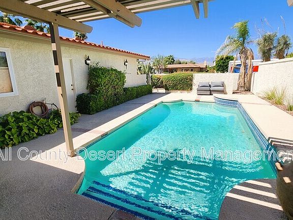 Welcome to the Palm Desert Country Club! This 3 bedroom 2 bath home features a large lot on private street with low traffic noise yet quick access to the main road of Fred Waring Dr. Upon entry of walled-in-secure yard, gaze upon front-loaded heated pool. Tall pitched ceilings, newer roof, bright new paint, crown mounding & exposed wood beam frame comfortable space. Tile floors & great room fireplace give a cozy atmosphere. Plantation shutters on backslider & windows for privacy. Remodeled kitchen, deep sink overlooking pool having newer stainless steel Whirlpool refrigerator, electric cook top stove with oven, dishwasher & microwave appliances. All bedrooms feature carpeted floor, ceiling fans, & mirror sliders accented by gold. Primary suite has practical double vanity sinks along with marble tile shower with brushed nickel sliding glass door. Guest bathroom has bathtub. 2-car garage with washer/dryer. This is a showcase property that embodies the variety yet simplicity of desert living. HOA fees included in the rent. All applicants must pass a comprehensive background screening including income verification and landlord references. Renter's insurance is required. All applicants must have the following: combined monthly income of at least 2.5 times the monthly rent, no prior evictions, good rental history and an acceptable credit score. If you see this home advertised online for less than the rental amount quoted here, the ad is a SCAM. We are the only authorized agent for this property. Please email us a link to any bogus or fraudulent ads so we can report it to the appropriate authorities. Please do NOT send money to anyone who offers keys in exchange for a deposit check - especially if they are out of state. When in doubt, please feel free to contact us.