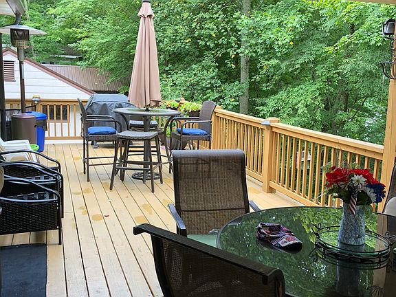 Waterfront Custom Amish built cape cod home. Maintenance free Hardie board siding. Cedar walls throughout. Custom hickory cabinets with granite kitchen. Walkout finished half basement, custom masonry fireplace. Huge deck with covered porch. Amish wood storage shed. Metal roof with gutter guards. Retaining wall. Dock included with COE approval. 1st floor master bedroom & full bath. 2nd floor 2 bedrooms or office/bedroom & FULL bath. Finished walkout half basement w/ washer dryer, stove, fridge, freezer, & cabinets. Well insulated home w/electric heat pump.
