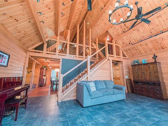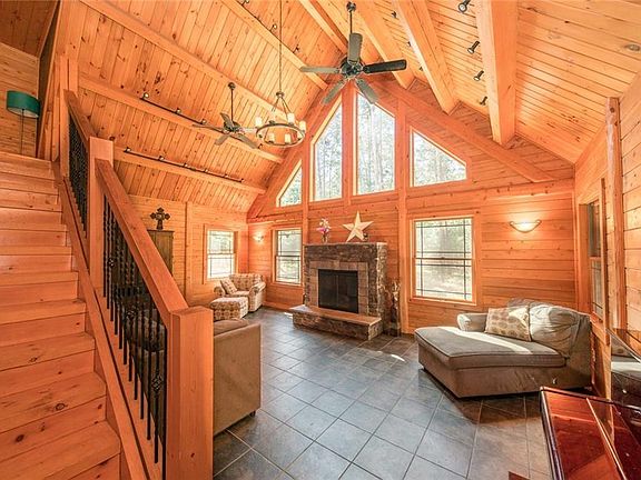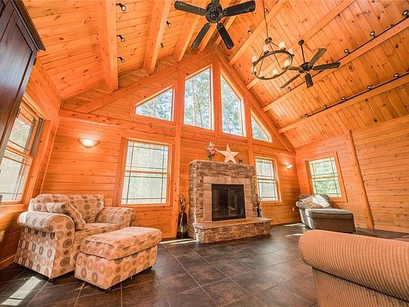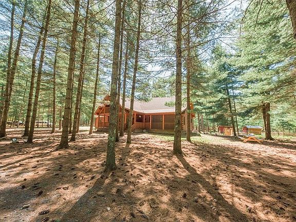 Tucked away in the pines, you will find this beautiful log home. Vaulted ceilings, wood fire place, exposed beams, make this home exquisite. The kitchen has solid surface counter tops, an island, and is open to the formal dining room with french doors that lead out onto the front porch. A master suite, laundry room, and half a bath complete the first level. As you walk up the beautiful stair case to the loft, there are 2 additional bedrooms, and a full bath. A balcony off the loft looks onto the private yard. The basement has a large family room for more living space.The property also includes other out buildings. A 12'x18' wood shed, a 18'x38' open structure, a 27'x28' metal pole barn. An additional 2 stall garage that is 24'x26' that is insulated. Great Hobby farm. Sits on 15.7 acres