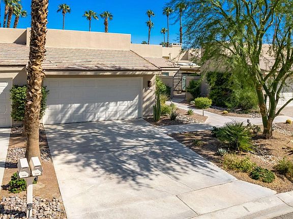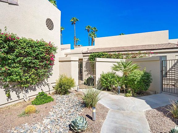 One of a kind - the Jacaranda model with a modern, open floorplan. The private front courtyard greets you with a fire-pit and is tiled for easy maintenance. Enter the front door to a gorgeous kitchen with an island that has been opened up and looks into the great room with high vaulted ceilings. Beautiful tile floors adorn most of the home, with carpet only in the bedrooms. The spa like primary bath has been remodeled and features walk-in tiled shower and double sinks. The hall bathroom has also been remodeled with a large shower and extended vanity. The patio enjoys a stunning view of the 16th fairway of the Championship golf course - you'll love watching the San Bernardino Mountains change color as the sun sets. Palm Valley Country Club - known as the fun club - with a 100,000+ sq. ft. clubhouse including a spa, fitness center, year-round dining, tennis and pickle ball courts and two 18-hole golf courses. The HOA also includes cable TV & high-speed internet. Plus, the neighborhood is guard gated. Short term rentals are allowed here - making it a wonderful second home or investment property. The seller may provide furnishings with the right offer - come see this home today!
