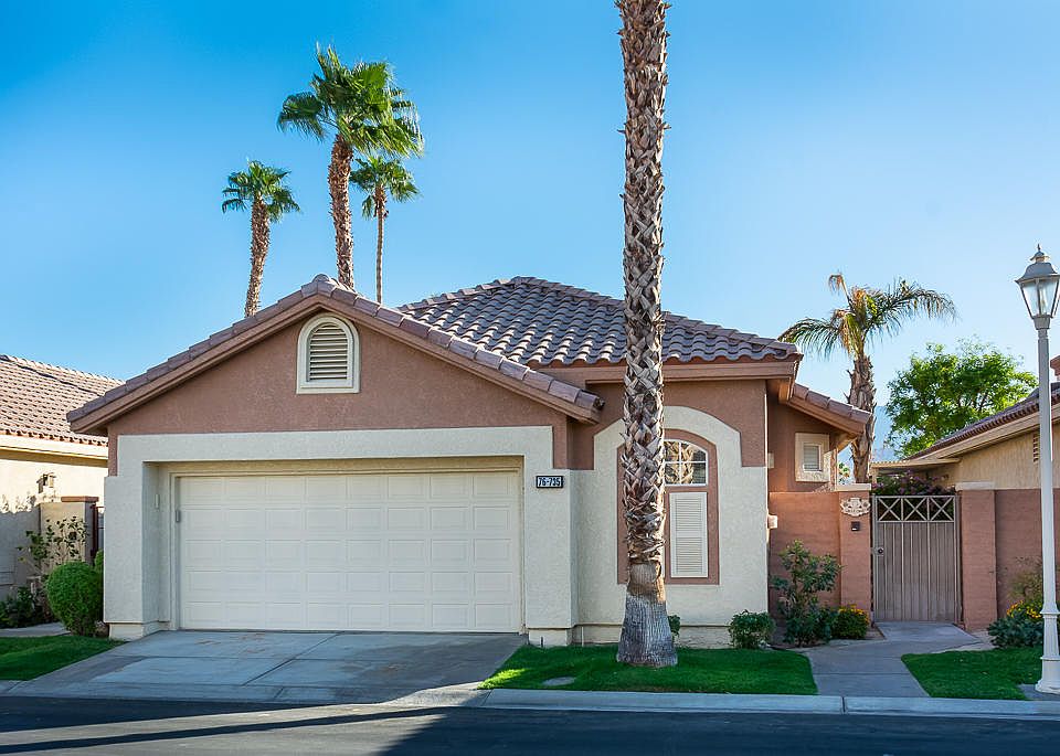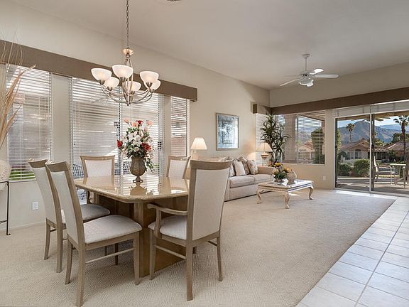Come home to your own personal oasis with amazing views in the desirable Oasis Country Club! Enter through a private courtyard to behold views of the golf course, lake and beautiful chocolate mountains. And two large private patios to enjoy those awesome views! The interior features a dine-in kitchen as well as a dedicated formal dining space open to the light and bright living room. With fans in every room, the primary bedroom has high ceilings, walk-in closet and a large attached bathroom with updated tile. The second bath has matching stylish tile for your guests staying in their private guest bedroom to enjoy. The office is good size to hold a murphy bed for even more entertaining space! All this and the Oasis amenities, an 18 hole putting course, 3 tennis and pickle ball courts, 18 pools/spas, and casual plus fine dining. Relax here within a 24 hour guard gated sweet community and access to the community owned golf club. This is truly an oasis that you can call home!