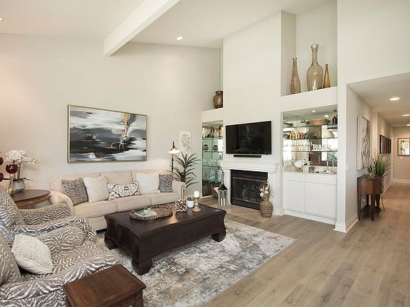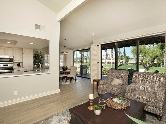 Completely remodeled 3bd/2ba golf course/ lake view condo has been meticulously renovated by the sellers who are both engineers. No detail has been overlooked. Included are: a light filled remodeled kitchen with walls removed to provide an open concept layout, quartz countertops, marble backsplash, new cabinet hardware, and upgraded appliances. The new, neutral laminate flooring throughout increases the open flow and invites you to visit the great room and relax with golf views and the refinished/upgraded fireplace. Continue to wander to the three beautifully refurbished bedrooms, with two new baths. The outdoor patio with a Weber grill and furniture features LAKE VIEWS! A beautiful vista of green grass and tranquil lake awaits you. Smart home features include wifi controlled Schlage lock, wifi Honeywell thermostat, wifi garage opener and a new tankless water heater. The very spacious laundry room provides ample space to convert part to a 3rd bathroom. Sellers have the plans. The bedrooms feature luxurious furnishings and a peaceful atmosphere-with a Zen patio off of the primary for private relaxation. This home is beautifully furnished throughout, including all bedding, linens, three new TVs, premium Bose sound system, fully stocked kitchen, all artwork, and decor. The location is great: on a quiet street, across from the pool and spa. Short term rentals are allowed; a perfect fit for a resident/or rental. Such a beauty in PVCC 'The Fun Club' will not be around for long!