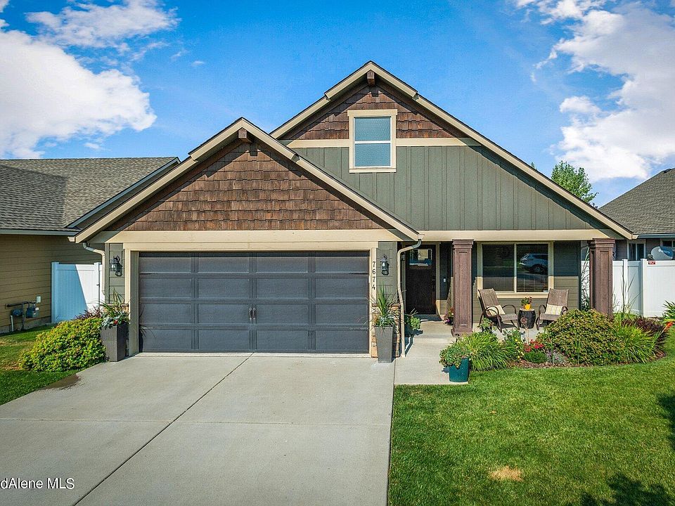 CHARMING CRAFTSMAN-STYLE RANCHER IN DESIRABLE COEUR D'ALENE LOCATION. Beautifully updated and well-maintained, this SINGLE LEVEL home is completely move-in-ready! The 1,571 sq ft floorplan includes 3 bedrooms, 2 bathrooms and an open kitchen/living/dining area with vaulted ceilings and abundant natural light. Neutral paint and engineered hardwood flooring throughout. Spacious chef's kitchen features granite countertops, stainless appliances, large pantry, island and informal dining area. Great room with gas fireplace, large windows and direct access to the covered deck and fully-fenced back yard. Two-car garage, extensive landscaping and fantastic curb appeal. Centrally located to nearby shopping, schools, paved trails and Landings Park with covered picnic areas, sports courts, playground and more. Don't miss this MUST SEE opportunity!