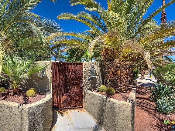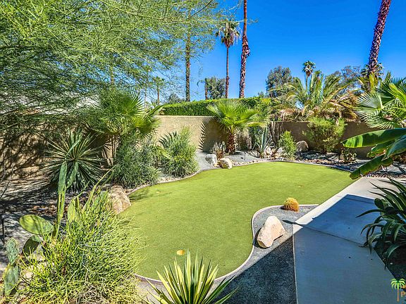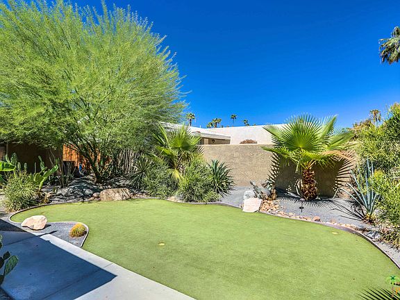 Welcome to your hidden desert oasis! As you enter the gated courtyard you're greeted by lush green plants, mountain views, and your own personal putting green! This three bed, two bath home features a fully-owned solar system, a private pool, and no HOA dues! The interior is bright and open with high ceilings in the living room, and lots of windows and light in the dining area. Tiled throughout with complimentary color tones there are three cozy bedrooms with the master opening directly to the pool! There is also an outdoor grilling area and a full-sized two car garage with extra room for a golf cart. This home offers tons of privacy, amazing views, and lots of sunlight! Come see it today!
