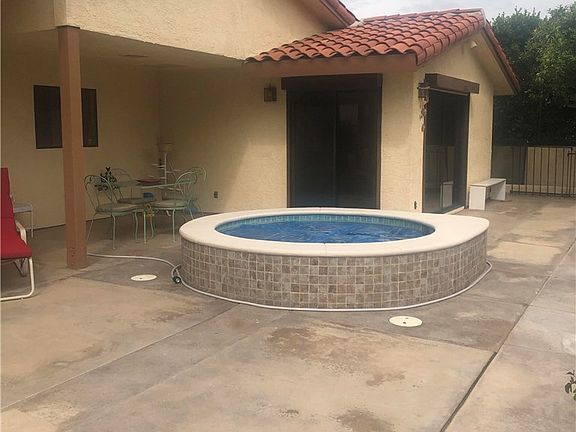 All repainted. Nice cabinetry with granite counters. Kitchen looks out to the golf course and huge hot water heated spa. Nice large concrete patio. Rear not fenced to the golf course. Large living room with attached dining area has a stone fireplace. Dining room set if you prefer to use it. Refrigerator. Garage has a roll up electric door,decorated tech flooring, washer, dryer, wash sink and passenger door direct to the residence. House stays very cool has a gated front entry. Newer bath room items.