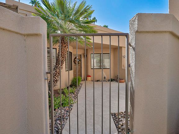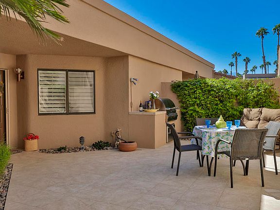 Welcome to Palm Desert County Club ! This highly desired Palms floor plan offers two spacious bedroom suites with attached bathrooms, along with a versatile den/office space that can serve as a potential third bedroom. The interior features many upgrades including elegant tile flooring and exquisite granite countertops. The kitchen boasts an open layout with modern stainless steel appliances. Both bathrooms have been remodeled, with guest bathroom offering a beautiful tiled walk in shower. Ample storage space is available throughout the property with a separate room laundry area. From the back patio, as well as the primary bedroom, one can enjoy stunning south-facing views of the golf course and majestic mountains. The patio has a retractable awning that creates a nice shaded patio. The front courtyard is adorned with tiled flooring, a BBQ area, and a charming dining space. The property comes fully furnished for making it move in ready.This home is only two doors away from one of the 46 inviting pools and spas. Palm Valley Country Club is home to one 18-hole par 72 and one 18-hole par 63 golf courses designed by Ted Robinson. The clubhouse features a bar, two restaurants, a day spa, and a hair salon. Additional facilities including a fitness center, tennis courts, and pickleball courts are available for an extra fee. Short-term rentals are permitted, providing flexibility to offset expenses.