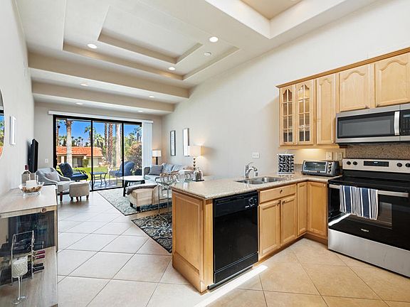 Welcome home to your lush Palm Valley paradise; a fully furnished condo with functional 2-bedrooms plus 2-bathrooms. South facing front patio to enjoy the Season's Sun with built-in BBQ for entertaining. Upon entry, marvel at the contemporary yet cozy interior. Sky-high ceilings promote natural light throughout. Flooring of carpet where you want it in sleeping spaces, yet tile where you need it in kitchen, halls, & great room. Compact floorplan ensures low stress upkeep. Top-of-the-line newer kitchen appliances, laundry washer + dryer, & HVAC system. Patio views of the Country Club's Championship 18th-hole to impress. Many possibilities for use include short-term rental, seasonal rentals, annual renting, and even full-time personal living. The well-established Palm Valley Country Club community has amenities to satisfy even the most discerning visitors. 36 magnificent holes across the 18-hole Championship & Executive courses of golf designed by Ted Robinson, Jr. accessible by private membership. Located just 10 miles from Palm Springs, the ease of access will keep you coming back for more. Nestled behind secure live guarded gates, the community has all the convenience of upscale living, such as stunning clubhouse, dining restaurant/bar options, 46 swimming pools + spas, dozens of tennis courts, fitness gym, spa services, pro shop, & much more. Massive future rental potential with close location to Acrisure arena. Own this rare opportunity for affordable paradise today!