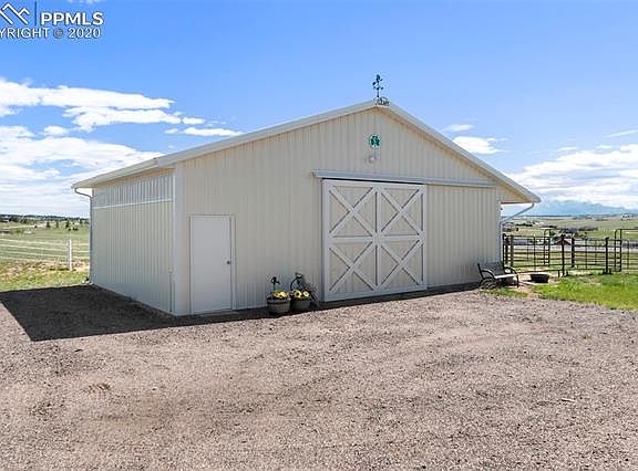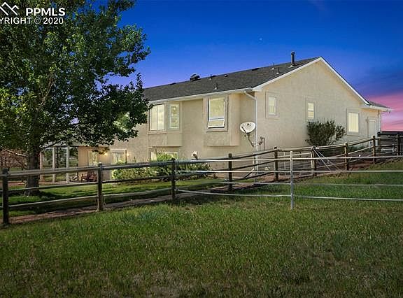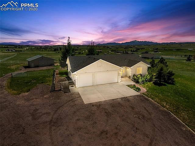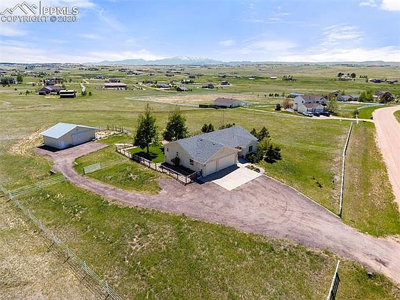 Sought after main level living rancher on 5 acres located in a horse friendly community in Black Forest with a new 2 stall barn! Unobstructed gorgeous mountain views. Completely fenced property including front yard, backyard, horse pastures. Remodeled and in excellent condition. Open and bright great room with water proof luxury laminate wood floors, large windows, walk-out to the back deck, gas fireplace w/ new stone surround and custom mantle. Zoned for horses. Domestic well. High quality Champion Windows with warranty. New insulated barn with two high quality stalls that are brand new with rubber mats, electric, large pull door, tons of lighting. Totally remodeled kitchen open to the great room. New solid surface counters, subway tile back splash, kitchen pantry, stainless steel appliances, tons of cabinetry with crown molding. Master suite with new carpet, bay window, walk-in closet, Fully upgraded 5 piece master bath with a jetted tub, double vanity with granite top, water proof luxury vinyl floor, full size shower with bench and seamless shower door. Lower level large family room with walk-out to the back patio, gas fireplace w/ stone surround, wet bar with wine fridge and storage. The full basement bath has a double vanity, new lighting, new fixtures and full bath. Fenced backyard with beautiful landscaping, rock pathways, gardens and mature trees. Award winning School District 38! Beautiful mountain views and tons of outdoor living space. Low maintenance stucco exterior. Exceptionally maintained. Main level laundry room. Neutral fresh paint.