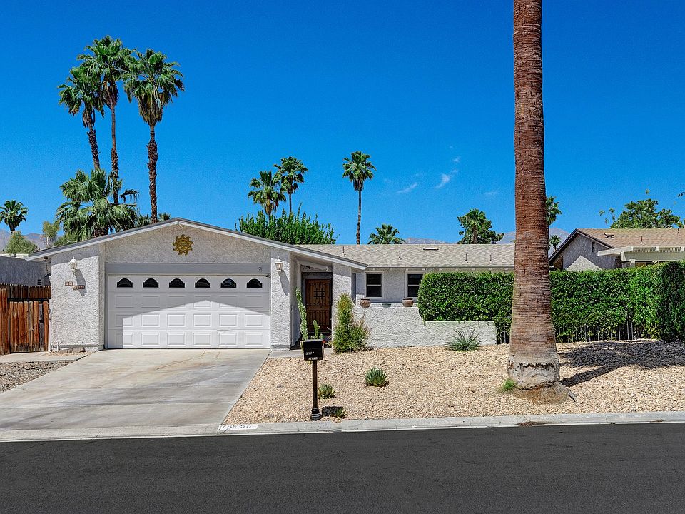 This charming house situated in the Palm Desert County Club offers a completely updated and contemporary desert getaway home. This house showcases a wide-open floor plan with vaulted ceilings, bamboo floors and a eat-in gourmet kitchen with stainless appliances. The property features modern upgrades throughout in a single story and quite spacious two bedroom home. The backyard showcases a covered lanai next to the pool/spa-essential for entertaining and relaxing in a desert home! The attractive and quaint community makes for an ideal vacation home, part-time Winter living, or a full-time residence. The central location makes it even more appealing, with excellent shops, restaurants and golf courses within minutes. The property features low maintenance, drought conscious landscape, a large two car garage, and a clean, inviting curb appeal.