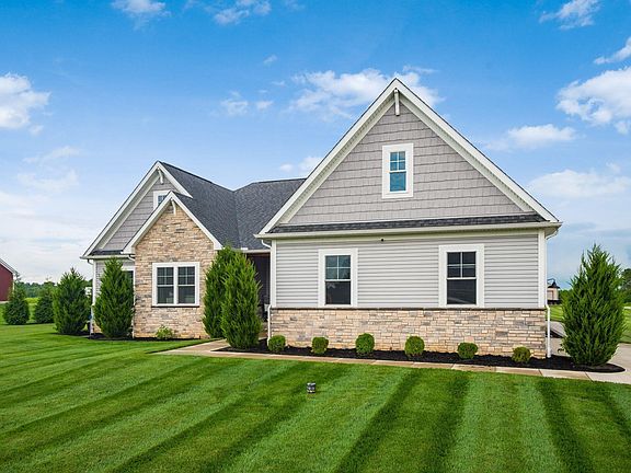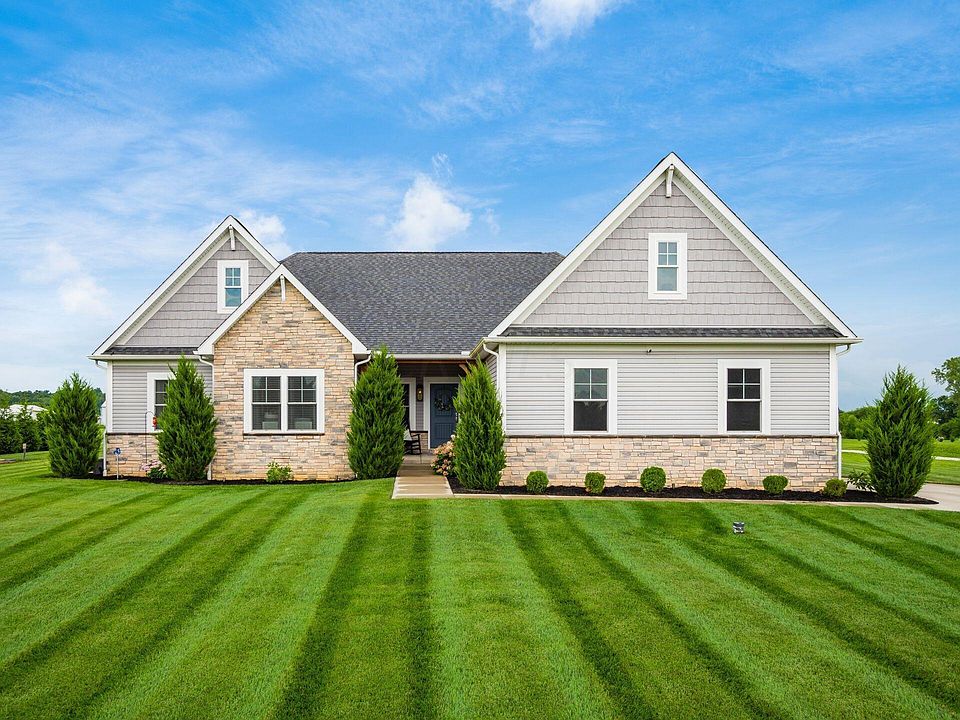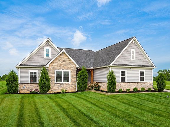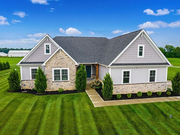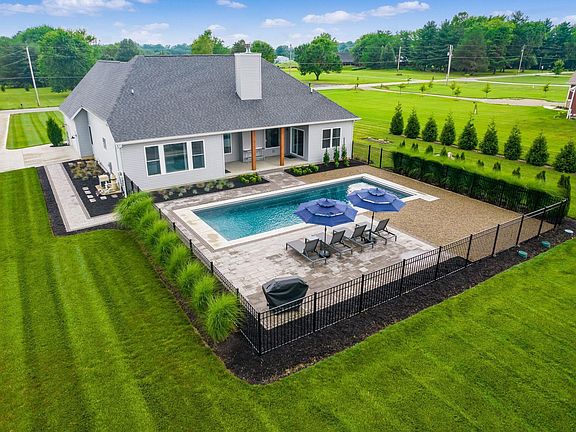Nearly new pristine ranch home. The spacious eat in kitchen features 11' ceilings, 42'' upgraded white cabinets, quartz counters, stainless steel appliances and a breakfast bar. Flex room with 3 piece crown molding and custom built in cabinets. The great room has 11' ceilings, an open hearth fireplace and large windows that provide a great view of the property. 9' ceilings, 5'' baseboards and LVP flooring. First floor laundry. Covered back porch w/ceiling fans. The 16'x40' heated salt water pool includes an 8.5' deep end, LED lighting and a retractable safety cover. The beautifully landscaped 2 acre lot has a stocked pond, a dock with electric outlets and an aeration system. Full poured wall basement with 9' ceilings, a bathroom rough in and a finished area. 200K in exterior updates.