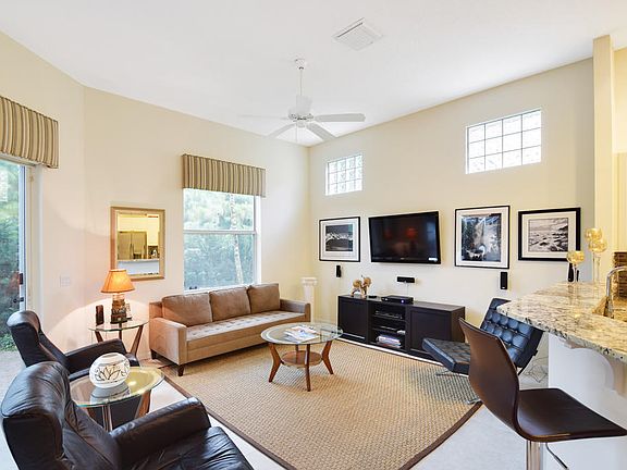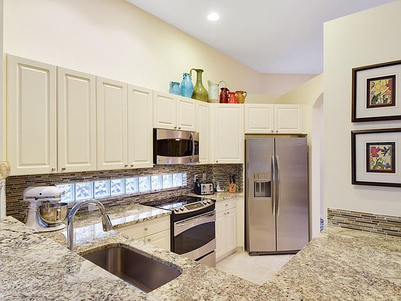 Live the South Florida lifestyle in this upgraded,designer decorated popular Jasmine model home. Light and bright one story, open floor plan features large skylight, granite counter and vanity tops, stainless steel appliances, upgraded washer/dryer, tinted windows, Hunter Douglass window treatments, extended paver courtyard with tall shrubbery ensuring privacy. Master bedroom dual closets, master bathroom large shower and Roman tub,Turn-key furniture negotiable