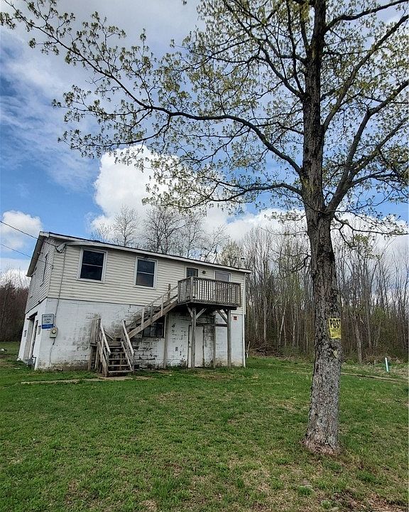 Country Living at it's best. Close to town, yet far enough away to have your privacy. This 962 SF house with multiple decks sits on 6.1 acres on a quiet road. 3 decent sized bedrooms, each with their own closets. The washer and dryer have hook ups right outside the full bath. The basement is a Do-It-Yourselver's dream come true. The garage doors open up on each side of the house for cross breeze. The beams in the basement have a hoist that can be switched between the both of them, great for a mechanic or woodworkers project that may require help lifting. Behind the house is a mostly wooded lot with ample room to put a cabin by the pond for your own secluded paradise retreat. Schedule your showing to see this hidden gem. A little elbow grease can bring this estate back to it's full potential- a home!