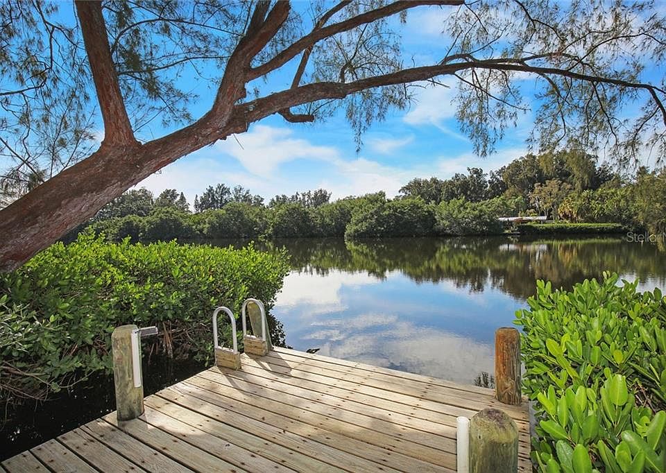 ACCEPTING BACK-UP CONTRACTS. Stunning views of Heron Lagoon throughout this spacious, updated home on almost 1/4 acre lot with 111' on the water. The main living area is open with vaulted ceilings and walls of French doors that open onto an expansive deck surrounded by majestic oaks and leading to the dock on the sparkling lagoon. Here you can simply sit and enjoy the view or launch a kayak and spend delightful hours on the lagoon. You will be pleased with the numerous updates and tasteful finishes including all new Luxury Vinyl Plank flooring, a large eat-in kitchen with granite counter tops, stainless appliances, wine refrigerator and lots of storage space. There is lots of room for family and friends with an ensuite Master plus 2 bedrooms and 1 1/2 baths on the main level and a very large Master Retreat on the 2nd level. This over-sized lot affords privacy and has a quiet, Zen-like feeling. The 2 car garage has additional space for storage and/or a workshop and there is lots of on-site space for additional guest parking. In 2018 a new roof and new A/C were installed on the second level, bathrooms were updated, extensive plumbing work was completed in 2019 and the new floors were just completed in Jan 2020. Come and enjoy the Siesta Key lifestyle with award winning beaches, a variety of good restaurants and shopping galore.