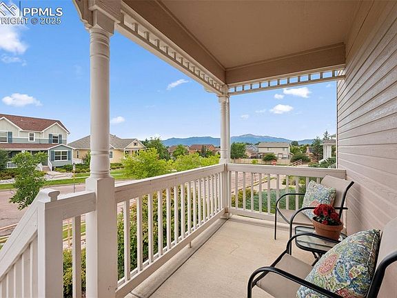 Welcome home to this charming home in Indigo Ranch with stunning Pikes Peak views and unforgettable Colorado sunsets from your front porch! From the moment you arrive, you'll be charmed by the welcoming curb appeal of this community with white picket fences and green spaces including a gazebo. Take a short stroll to the neighborhood park, walk with your 4 legged friend, or play frisbee. This home features an open-concept layout with 9-foot ceilings, rich hardwood floors, open floorplan, and a cozy gas fireplace. Laundry is on the main near the door to the garage and 1/2 bath, and the family room walks out to the private, fully vinyl fenced back yard and automatic sprinkler system. The bright, open kitchen is the heart of the home, complete with a breakfast bar, pullouts in the cabinets, custom under cabinet lighting, stainless steel appliances and plenty of counter space. Upstairs, you'll discover an oversized loft with views of Pikes Peak that makes a great secondary living space, home office, or media room. The private primary suite offers a peaceful retreat with a walk-in closet and an ensuite bathroom with dual vanities. Two additional secondary bedrooms are generously sized and share access to a full hallway bathroom, perfect for family or guests. Enjoy extras like A/C, humidifier, Smart thermostat, 2024 Furnace, 2022 Water Heater, Insulated garage door, and a large crawl offering lots of storage. Quick and easy access to both Powers as well as Woodmen, and only a few short minutes to restaurants, shopping, hospital, Peterson & Schriever military bases. With a thoughtful layout, mountain views, stylish finishes, and a prime location in a well-kept community, don't miss out on this beauty, welcome home!!
