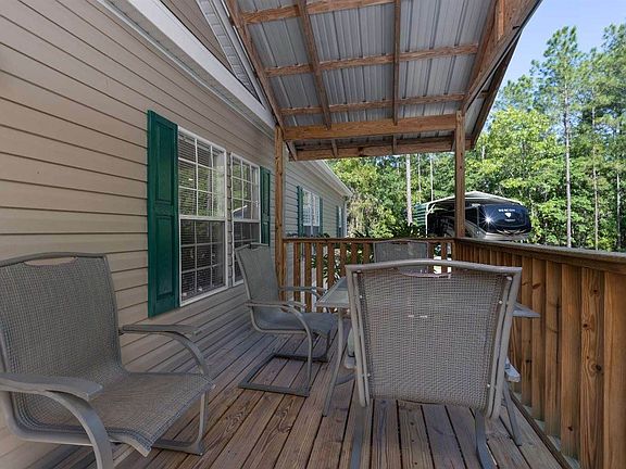 Convenient to High Springs, Gainesville, Trenton, Fort White and Lake City! This home is a stunner with Wood laminate flooring and crown molding throughout. Beautiful wood-burning fireplace, Gourmet kitchen with center island, custom stove hood and lots of cabinets, Master suite with large luxurious bath with two entrances, double vanities, roman tub and large walk-in closet. The guest bath has a separate dressing area. Outside you can enjoy the view of the 5.11 acres from the covered front porch. There is a 24x41 metal building with roll-up doors on a slab with electric and a 14' high RV Port with hook ups.