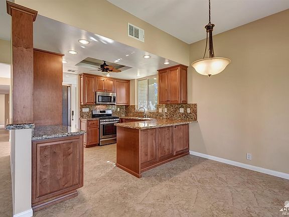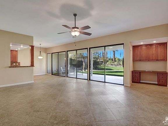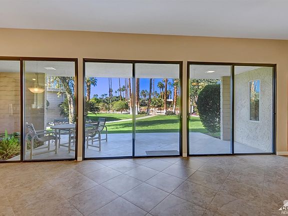 Priced Reduced!!! This is one of the best buys in Indian Wells! Totally remodeled Sandpiper condo by one of Indian Wells most respected contractors with quality workmanship throughout! Large rooms and high ceilings with new granite counters in kitchen and baths, Kitchen Aid appliances, raised bathroom counters, custom wood cabinetry and hardware, porcelain tile floors and carpeted bedrooms, all new windows except sliders, built-in storage, ceiling fans, porcelain tiled back patio overlooking community pool with lovely landscaping. Separate laundry room with pedestal washer and dryer (included) and office nook off Living Room. The bedrooms have a private patio with great south mountain views, and landscaping with updated irrigation. Includes 2 car detached garage. Condo is located within close walking distance to the Indian Wells Country Club. Indian Wells property owners enjoy discounts on golf, food and hotel services.