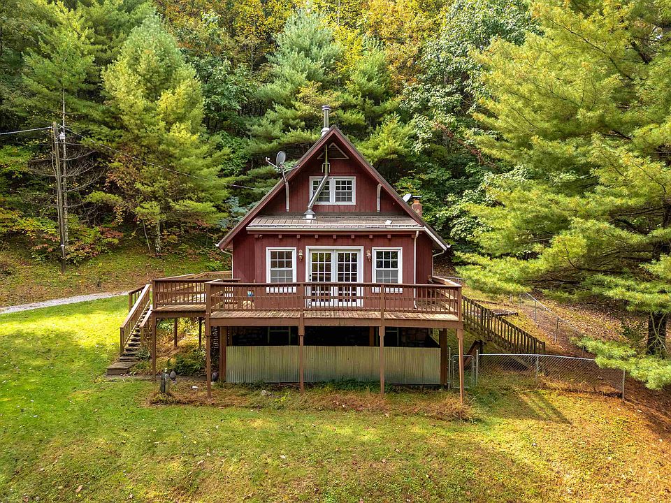 Welcome to this charming 3BR/2BA A-frame bungalow nestled on over an acre. The main level has hardwood flooring & an open floor plan, seamlessly connecting the living, dining, & kitchen areas. Kitchen boasts stainless steel appliances & lots of cabinet/counter space. The primary bedroom with ensuite offers privacy & convenience. An additional full bath on the main floor adds extra flexibility. Upstairs, you’ll find two additional bedrooms & a convenient half bath. The downstairs area is mostly finished with LVP & tile flooring, providing extra living or recreational space. Step outside onto the large deck & enjoy your morning coffee & fresh air. The property features two efficient heat pumps & newer wood stove to ensure year-round comfort. A detached storage building adds extra space for tools or equipment. Conveniently located just 20 minutes from Pearisburg or Dublin, & 30 minutes from Blacksburg. This property is perfect for those seeking tranquility in a scenic setting.