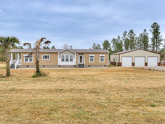 Discover modern comfort on 10 acres with this four-bedroom, two-bathroom home. Inside, an elegant kitchen awaits featuring white subway tiles, an oversized island, sleek stainless steel sink and appliances and wooden ceiling beams.