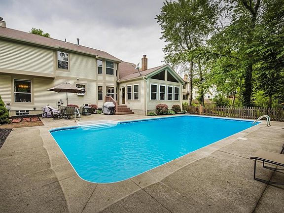 Enjoy Summer in your beautiful new home w/sparkling salt water (heated) swimming pool! This well cared for home features an open floor plan & spacious living areas. Over-sized/updated kitchen is fabulous for the chef: gleaming hardwood floors, SS appliances, quartz counter tops, & xtra lg island. Kitchen opens to two story family rm w/fireplace. Living & dining rms are generous in size. Vaulted 4 season rm w/French doors overlooking pool. Lg vaulted owners suite & spa w/lg walk in closet, dual vanity, soak tub, shower & fireplace! Spacious bedrms w/shared bath. Remodeled Laundry rm, new carpet, garage door, & HVAC w/touch screen display thermostat, newer roof. Superb location on a corner lot with lush landscaping & fenced yard w/shed. Convenient to: Easton/shops/freeways/airport!