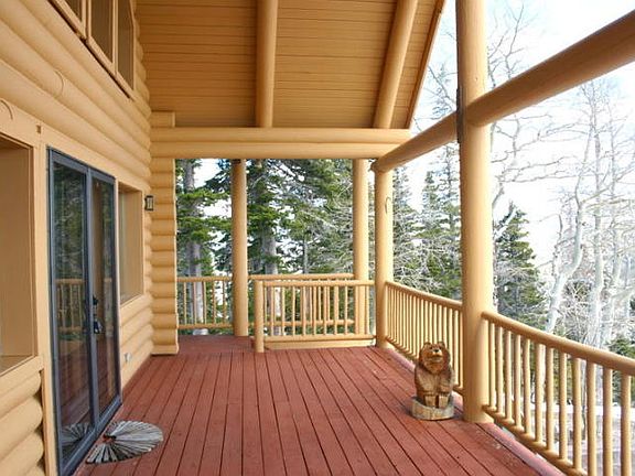 Enjoy the AMAZING VIEWS of Brian Head ski area and the surrounding valleys from this custom built log home. This custom home sits on the top of a six acre parcel affording the owner space and privacy. The interior has beautiful wood finishes. The custom kitchen has tile flooring, granite countertops and an island for extra storage and seating. Enjoy the view from the two story windows in the dining and living rooms while admiring the beautiful stonework surrounding the wood stove. The master bath has beautiful tile and a jetted tub. The wood deck provides room for entertaining or just relaxing after a day of fun. In addition to a basement garage there is a detached garage providing lots of storage room for your summer and winter toys. Sale includes a snow cat in the garage.
