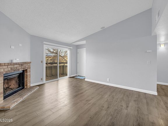 Prime South Reno location in the highly desirable Woodchase community. This 2 bedroom, 2 bath condo offers 887 square feet of comfortable living just minutes from shopping, dining, freeway access, and nearby hiking and biking trails. Inside, you will find updated laminate flooring and baseboards, upgraded kitchen appliances, and a newer water heater. The kitchen refrigerator, along with the in-unit washer and dryer, are included. The real wood burning fireplace & ceiling speaker system set up, creates a warm ambiance throughout the home. Step outside to a peaceful terrace with mountain views and an additional storage closet. The HOA covers water, sewer, trash, and security, and includes one covered parking space plus one permitted guest space. Residents enjoy a fitness room, clubhouse, pool, spa, two dog parks, and beautifully maintained expansive lawns and walkways. RV and boat storage options are also available through the HOA with permit - first come first serve . Low maintenance living in one of South Reno's most convenient locations. Schedule a showing today!