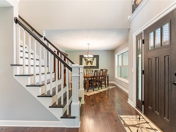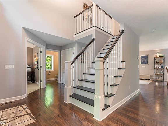 Welcome to 3600 sq ft of thoughtfully crafted living space nestled in a truly breathtaking setting. Surrounded by lush woods, a babbling brook, and abundant wildlife, this one-of-a-kind property offers peace, privacy, and the soothing rhythm of nature—a true sanctuary for hunters, nature lovers, or those seeking an escape from the everyday. This custom-built home greets you with a charming covered front porch and inviting foyer that opens to warm, light-filled spaces. The main floor features a private home office, formal dining room, and an open-concept living and dining area ideal for entertaining. The gourmet kitchen is a chef’s dream—complete with stainless steel appliances, quality cabinetry, and a functional mudroom entry from the attached garage. Upstairs, you'll find three spacious bedrooms plus a large bonus room that could easily serve as a fifth bedroom, studio, or media room. The main bath includes dual quartz vanities, a tub/shower combo, and a privacy pocket door. The second-floor laundry adds everyday convenience. The primary suite is a peaceful retreat, featuring a transom ceiling, oversized windows with serene views, and a spa-inspired bath with a tiled walk-in shower, quartz double vanity, and pocket doors for added elegance. The finished lower level offers additional living space with a rec room, a custom butcher block dry bar, the fourth bedroom, and a full bath—perfect for guests or multi-generational living. An oversized detached 2-car garage with a covered walkway provides ample storage and includes a bonus room above ready for your finishing touches. Every detail of this home was designed for comfort, style, and a seamless connection to the natural surroundings. Move in and begin living the private retreat lifestyle you’ve been dreaming of.