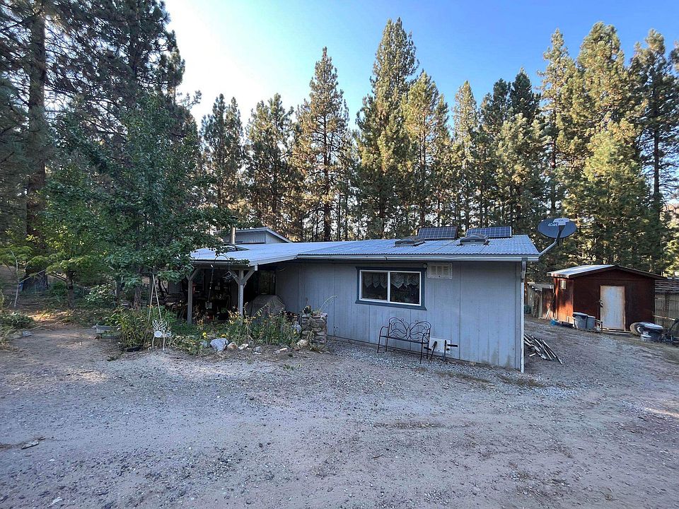 Looking to live off the grid but close to town? Cute studio cabin with kitchen and back area and solar. Just a short ride or walk to town but private and rural. Beautiful spot with views and privacy. Fruit trees and many other beautiful trees throughout the property. Nice area for gardening and a few outbuildings to store your items. Kitchen and back area (laundry area) is on foundation, other part of home is not. No permits on structures. Cash or seller finance only. Generator included in purchase.