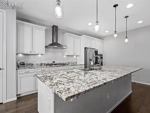 Nestled on one of the best lots in Cobblestone Ranch, the home faces open protected space that leads to miles of trails in a highly coveted neighborhood. Countless builder upgrades were selected when the home was built! As you step inside, you will find 10’ ceilings and beautiful dark hardwood floors throughout the whole main level. The gorgeous gourmet kitchen is perfect for the chef in your family. The kitchen features light and bright finishes with granite counters, double ovens, an upgraded gas cooktop, separate pantry, and a stunning 10’ long eat-in kitchen island. This beautiful kitchen is truly the heart of this home! Just off the kitchen, you will find the extended dining room complete with large windows and access to the professionally landscaped backyard. Tucked away in a private corner of the home you will find the primary suite with a en-suite bathroom complete with a spacious walk-in closet and a granite vanity. The main floor also features two spacious secondary bedrooms. One of the rooms can serve as a home office with unobstructed views of the open space and walking trails just out the front door. The two bedrooms share a full bathroom conveniently located for guests. Downstairs you are met with a large bonus area that can transform into an entertainer’s dream area. The finished basement features a second primary suite with a full bathroom giving you the option of multigenerational living! You will also find 500 square feet of storage space and a 5th bedroom. The opportunities in the basement are endless! The backyard features an extended concrete patio and beautiful Trex decking that leads to a grass area and fire pit. Be sure to drive by the Cobblestone clubhouse! The amenities include a pool, tennis courts, miles of walking trails, and easy access to the 168-acre regional Cobblestone Ranch park! You are within minutes of Castle Rock and Parker. Your dining, shopping, and entertainment options are endless! Home is Virtually Staged.