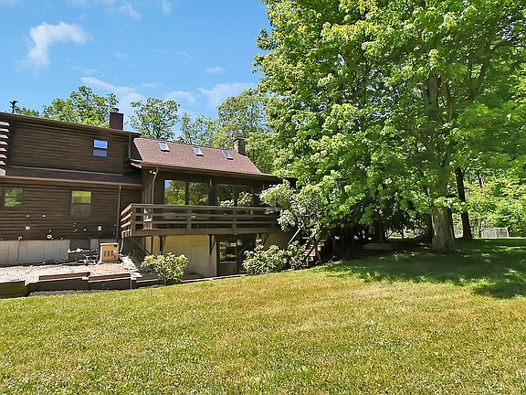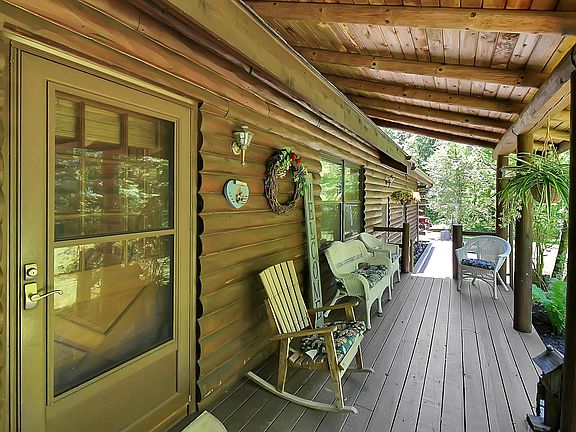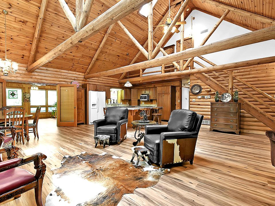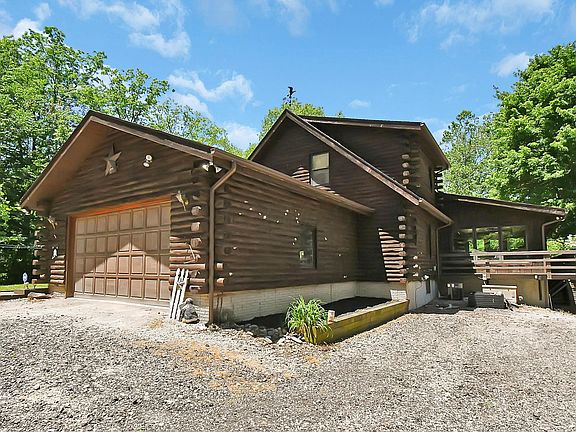 Incredible Custom Built 2 story Log Cabin with tung and Grove wood ceilings. Beautiful wrap around deck overlooking woods and a pond. Full walk out basement has been used for a bedroom space and rec area. 2 full master bedrooms one on the first floor and one on the 2nd floor. 3rd bedroom used as den/bedroom. A Loft over looks the great room. Features a Huge Barn 1500 sq.ft with 30ft. ceilings a loft and cement floors. 3 ways to heat Electric Heat pump, wood burning furnace, and propane furnace is newly added. New lvt hickory flooring, new paint, NEW Roof, new gutters, downspouts,flashing and seal kits, New skylight, New granite in Kitchen and bathrooms. This is on City Water. Peaceful and serene sitting on 24 acres of total privacy.