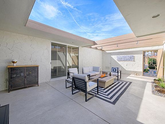 The Sandpiper condos in Indian Wells CC are part of the legacy of iconic mid century architect William Krisel. Known for his clean and simple lines, Krisel is largely credited for bringing modernism to the desert.Current owners updated this striking unit in 2014 with an eye to keeping the mid-century aesthetic but opening it up to complement our current desert lifestyle. The flow between courtyard patio, public living spaces and the poolside patio is perfect for entertaining. The great room features a beautiful contemporary fireplace which can be enjoyed from dining and kitchen areas as well. The kitchen features beautiful quartz counters and stainless appliances.Both the principal suite and guest suite enjoy access to the interior courtyard and are conveniently distanced from each other. The third en suite is a perfect office or den space but also acts as overflow for overnight guests with a Murphy bed and access to poolside patio.The two car plus golf cart garage is attached and offers generous storage space. Indian Wells Country Club is a highly sought after private club which offers several membership categories. The community is also located a convenient golf cart ride to the Indian Wells Golf Resort which offers reduced rates to residents.This home is offered turnkey furnished.Call today for your private showing. You will fall in love with this lovely unit in it's gorgeous setting.