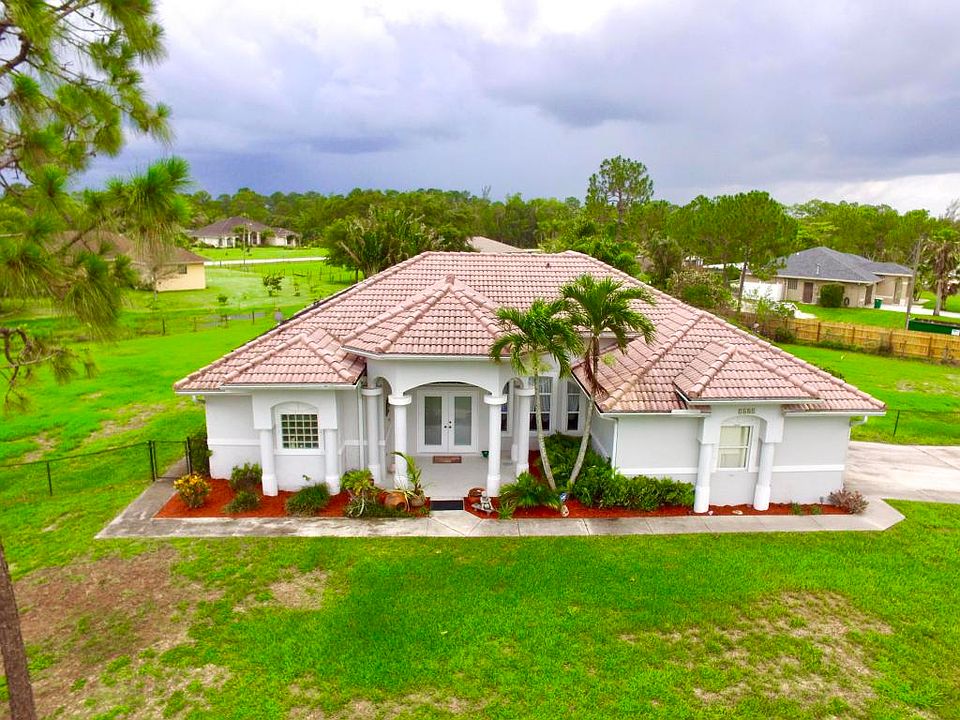 JUST A COMPLETE PACKAGE !!! EXCELLENT WELL MAINTAINED 3 BEDROOM 2 BATH 2 CAR GARAGE SCREENED POOL & SPA ,TILE ROOF HOME ON A CORNER LOT ON 1 PLUS ACRES WITH POSSIBILITY OF CITY WATER !!! OPEN SPLIT FLOOR PLAN. LARGE DESIGNER KITCHEN WITH BREAKFAST BAR, BREAKFAST NOOK. MASTER SUITE WITH SITTING AREA, HUGE WALK IN CLOSET, HIS AND HERS SINK AREAS, GARDEN TUB, SHOWER AND PVT TOILET. THIS HOME ALSO BOAST FORMAL DINING, FORMAL LIVING, AND HUGE SCREENED POOL AND SPA. NO POND. NO HOA, - BRING YOUR RV, BOAT , TRAILER OR HORSES. !! SAVE ON INS- CUSTOM ARMOR SCREEN BUCKLE & STRAP SYSTEM FOR HURRICANE PROTECTION COMMERCIAL GRADE !! LOTS OF ROOM FOR GUEST HOUSE, INLAW QUARTERS OR WORKSHOP. CORNER LOT. PAVED ROAD. EASY ACCESS TO HIGHWAYS, SHOPPING, SCHOOLS AND BANKS !! CBS HOME !!
