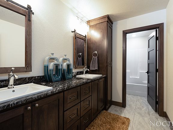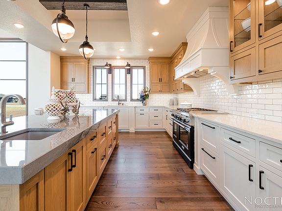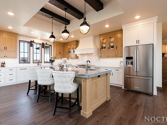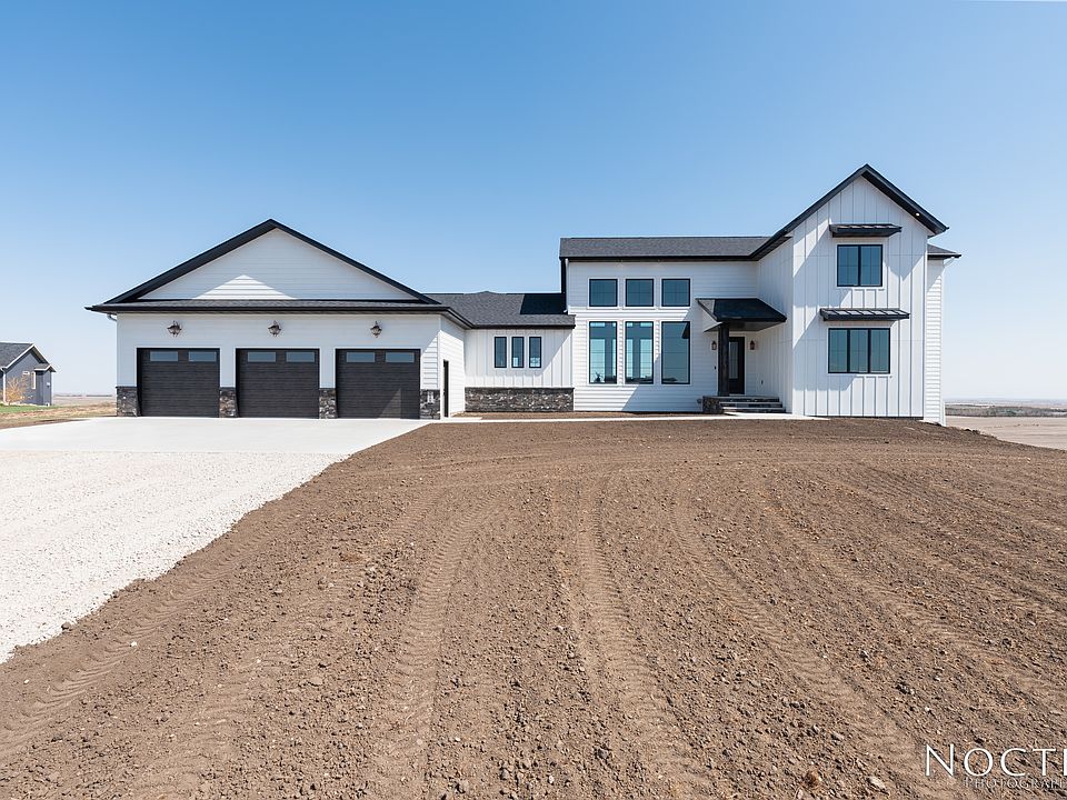 Hallmark Homes offer this 5660 SQFT new construction home on 1.63 Acres in Bismarck, ND. Custom cabinets throughout. A gourmet kitchen has a 10ft island, gas range with double ovens, granite countertops, prep sink and hand hewn ceiling beams. A pantry hidden behind the kitchen has plenty of storage. The 2-story great room lets the sunshine in from Anderson windows from the east and the west with views for as far as the eye can see. The master has his and hers walk-in closets, soaking tub, double sinks with quartz countertops and a custom tiled shower. In addition to the kitchen, dining and great room on the main floor, you will also find the master suite, laundry, office, 1/2 baths and a large mudroom. The walkout lower level is ready for entertaining or just hanging out. Serve guests in the bar on the "live edge" countertop, watch movies or play a friendly game of pool. There are 2 large bedrooms, a full bath with double sinks and tiled shower, and additional 1/2 bath that finishes the space. The partially covered deck is perfect for summer BBQ's or relaxing. Upstairs includes 2 bedrooms, full bath and a bonus room. The vaulted garage is a dream with workshop space and even room for a hoist. Enjoy some space in the country yet close to town.