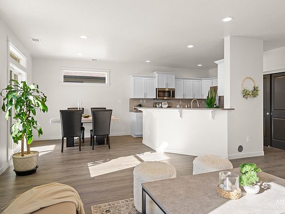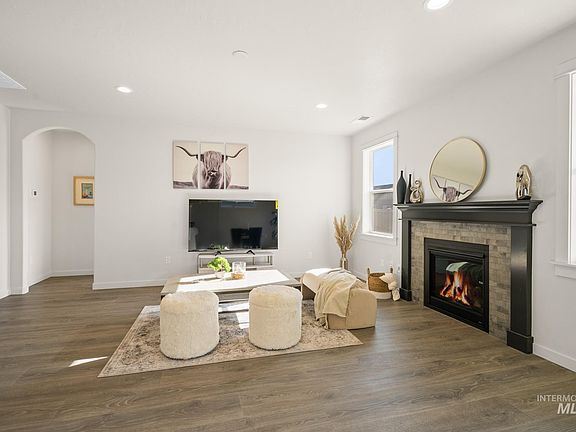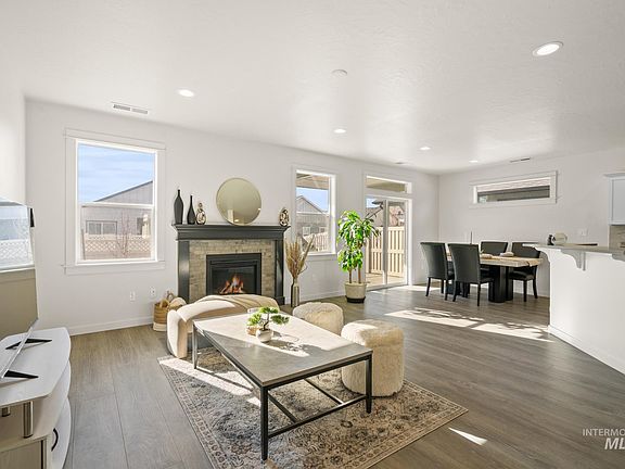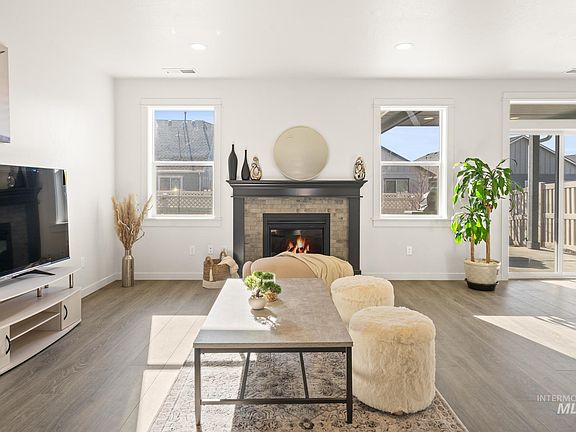 Charming newer home in prime location! This home offers the perfect blend of elegance & accessibility with split bedrooms and LVP throughout. Front porch with stone design and LED lighting invites you inside. A wide hallway leads to an open and airy great room with natural light. The elegant and cozy living room, complete with a fireplace, provides the perfect space for relaxation. The stylish kitchen is a chef’s delight, featuring SS appliances, a gas stove, a breakfast bar with quartz countertops, upgraded soft close white cabinets, and ample workspace. The spacious primary suite offers bathroom with shower, dual sinks, quartz countertop and an enormous closet. Enjoy outdoor living with a covered back patio illuminated by LED lights, perfect for entertaining or unwinding in the evening. The garage has been upgraded with a 4 foot extension. Highly desirable Boise neighborhood with trails and park surrounding. Conveniently located just minutes from Costco, Airport and I-84. Don’t miss this opportunity!