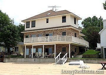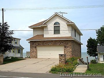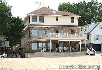 LAKE FRONT HOME: A great sandy beach is the setting for this awesome lake front home. 3 bedrooms, 2 full baths, 2 half baths, 2 Kitchens. Living, Dining, Kitchen with Corian counters, 1/2 bath, Foyer on Main floor. 3 bedrooms, 2 full baths, Office and Laundry on Second Floor. Family room, Kitchen with S, R, DW, GD, M, 1/2 bath, Laundry, and storage in lower level walkout. Beautiful huge windows throughout the house and fantastic lake views from most all rooms. A skylight in each of the full baths provide plenty of light. Each full bath has a tub with stand alone shower. The Master bath has a whirlpool tub. Lakeside balcony and concrete patio. 2 car attached garage with plenty of built in storage, 5' x 7' storage at the rear of garage. Underground sprinkler system run from well next door to the West with shared well agreement. Buyer to assume balance of water assessment at closing.