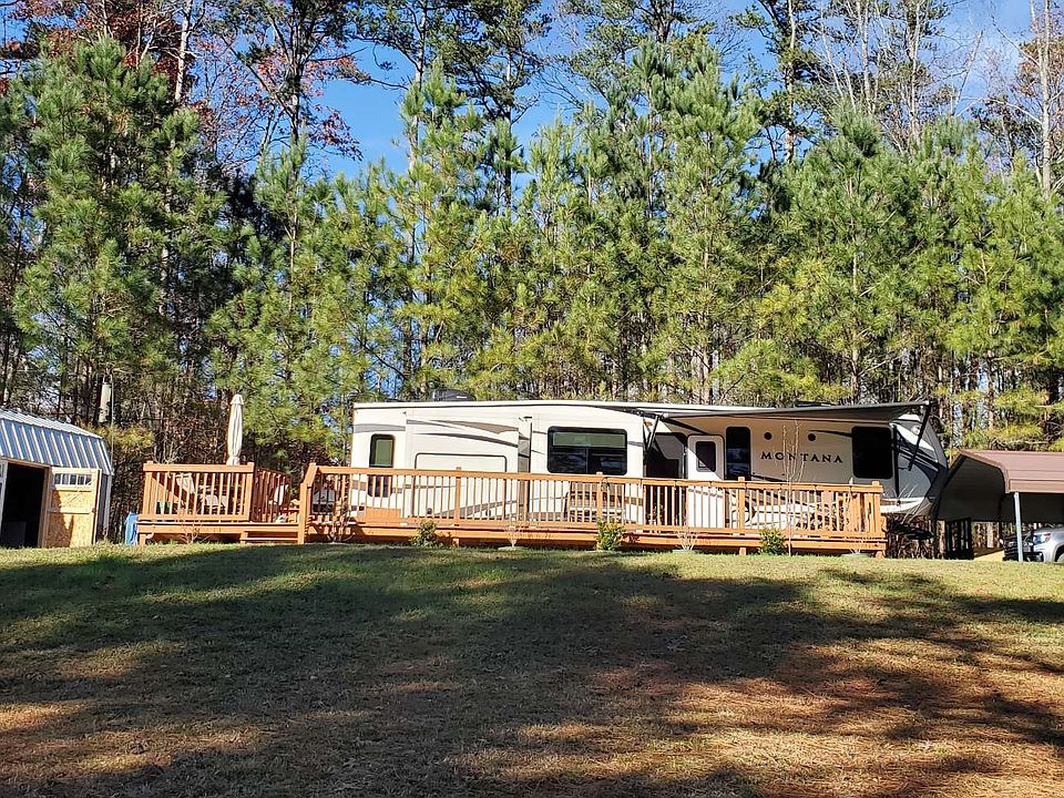 Beautiful, well maintained 40ft, 2017 Montana RV on 1.25 unrestricted acres, cleared with creek! 40 ft deck all around. Full size frig, upgraded custom made furniture, theater seating, tinted windows. 1000 gal well, with 8 month new septic and pump. Fire pit, street light on driveway, new storage building