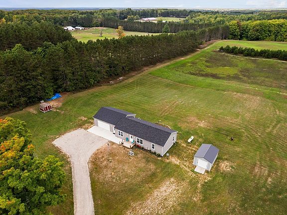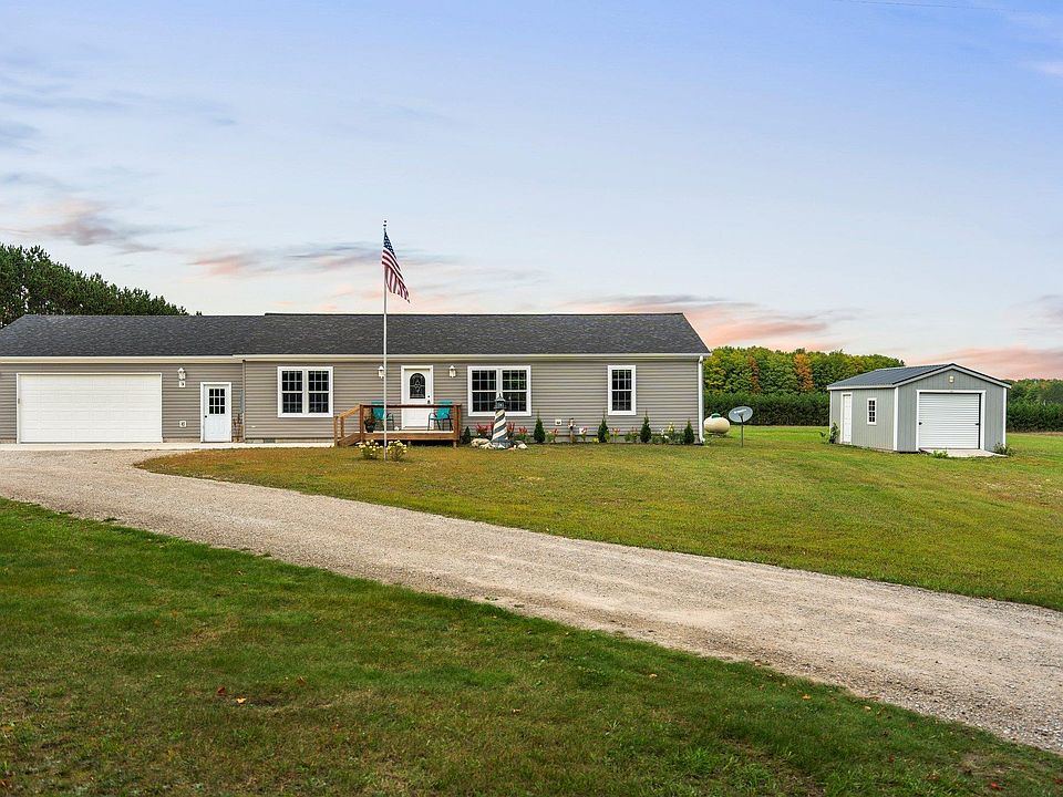 Just like new 3 bedroom 2 bath home, move in ready with an open floor plan beautifully situated on 2.47 acres. Attached 2 car garage, central air, front porch in addition to a private back deck and 2 storage sheds. Country setting just minutes from town and 30 minutes to Traverse City or Cadillac. This newer home offers a split floor plan with a primary suite that features a walk in closet, linen closet and full walk in tiled shower. Spacious island kitchen with all appliances included and plenty of cabinets and counter space. Spacious living room and dining room with sliders to the private back deck. 2 additional bedrooms with walk-in closets and full bath. Mudroom/laundry room right off the garage offers a utility sink, cabinets and washer and dryer included. Beautifully landscaped with flowering bushes, perennials and gravel driveway.