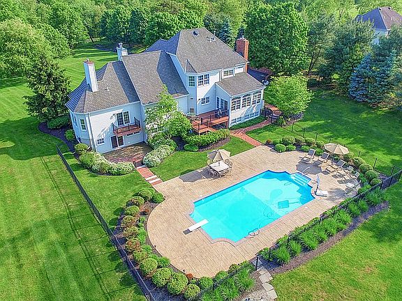 Admire picturesque views of rolling hills & the scenic Raritan River from this majestic estate. Special distinctions include a 1400 square foot finished walkout lower level--including an expansive leisure area, office, movie theatre with tiered seating (7 reclinable chairs/screen/projector INCLUDED), NEW vinyl plank flooring, full kitchen and 1.5 baths. Light and bright, this space also offers ideal in-law suite potential. Experience an open concept floor plan throughout the main level. Discover soaring ceilings, three gas fireplaces, hardwood floors, 5 1/4" baseboard, decorative mouldings, recessed lighting, built-in speakers plus multiple palladian and transom windows. An updated kitchen provides premium stainless steel appliances, wall oven, gas cooktop, instant hot beverage dispenser, walk-in pantry, granite island with seating and convenient bar sink. You'll find a double-sided fireplace in the first floor master suite--along with a sitting room, balcony with serene backyard views and en suite bath--complete with a heated floor, two vanities, jetted tub, stall shower and dressing table. All bedrooms are equipped with walk-in closets, overhead fans and lights. The princess suite offers a private full bathroom. The 3rd and 4th bedrooms share a Jack & Jill bathroom. There's plenty of storage in the basement and two floored attics. Outside is equally impressive--showcasing lush professional landscaping, new driveway (2015), composite deck with maintenance-free railings, paver patio and in-ground pool heated by solar panels. More features include a security system, basement workshop, SMART enabled garage door openers, new main level heat/air (2019), hot water heater (2018) & wireless SONOS pool and home speaker system controlled from a new receiver. Outdoor adventurists will adore the backyard tree deck & zip lines plus easy access to trails, kayaking, canoeing and fishing. All this, and in close proximity to the Neshanic Valley Golf Course, town, YMCA, library and Bridgewater Mall. Watch the seasons unfold from this magnificent property!