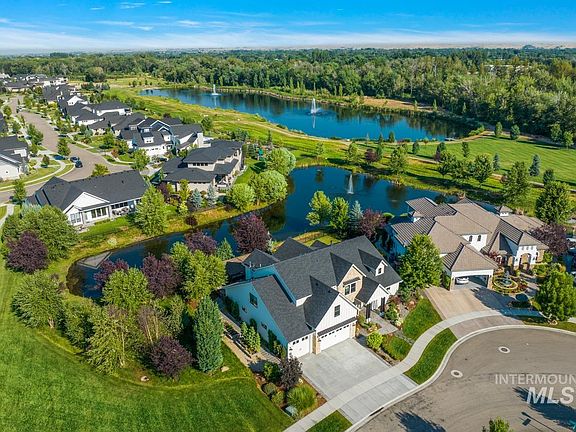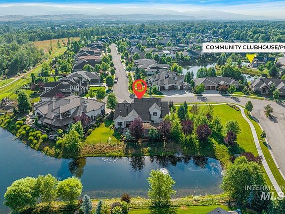 Waterfront Living! Immaculate home on a prime lot nestled on one of the tranquil lakes in Eagle’s Mace River Ranch. Impressive outdoor area, perfect for open-air gatherings, featuring ample counter space, storage, beautiful landscaping, covered patio, firepit, & custom pergola. The meticulously detailed interior boasts of high ceilings, wood beams, hardwood floors, stunning floor-to-ceiling tile fireplace, & custom built-ins. Gourmet kitchen showcases quartz countertops, expansive island, Thermador appliances, double oven, gas cooktop, custom cabinetry, Butler's pantry, oversized laundry & mud rooms w/built-in storage, tech nook & Executive office. Main level primary suite offers a sitting area w/a dual-sided fireplace, water view, private patio access, dual vanities, sumptuous soaking tub & tiled walk-in shower. Bonus & 3 bedrooms upstairs are an ideal layout that make the most of this two level well executed design.