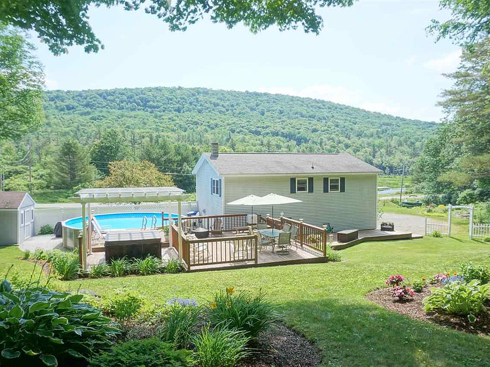 Pristine and ready for new owners! Our 3 bedroom 2 bath raised ranch style home is sited on 3.15 acres. Spacious living room with built-in bookcases and a large picture window opens into the kitchen for easy transitions and gatherings. A wonderful eat-in kitchen with large seating area and great windows letting in southern sunshine and summer breezes. 2 bedrooms up and a newly remodeled full bath on the first floor. Enjoy the family room and playroom as well as an additional bedroom and ¾ bath. The backyard is a perfect spot for entertaining with multi-level decks, a hot tub and pool. Explore the woods or relax in the shade. 20 minutes to Smuggler’s Notch and an easy trip to town or Burlington!