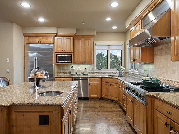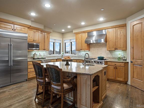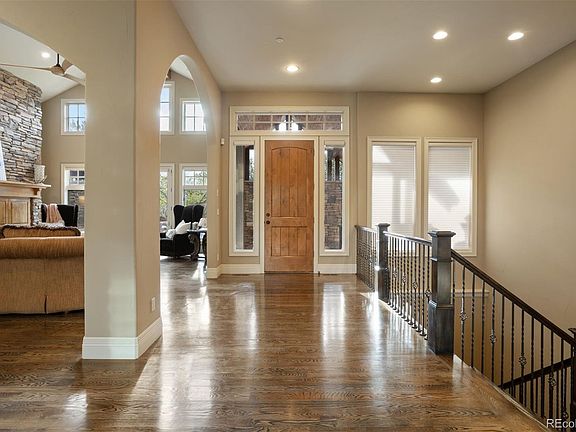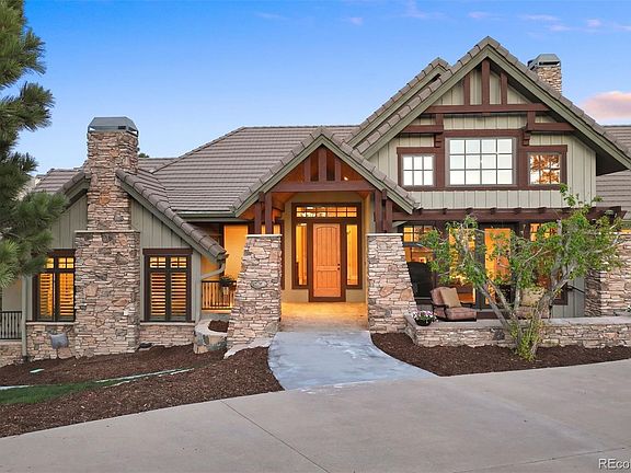 This multi-level residence boasts a seamless blend of expansive entertaining areas and private sanctuaries, offering a lifestyle of both grandeur and tranquility. As you step inside, a sense of warmth envelops you in the cozy living room, adorned with a striking stacked stone fireplace and direct access to the front courtyard, perfect for intimate gatherings or quiet moments of reflection. Custom stained hardwoods grace the main level, leading to a distinguished study featuring built-in bookcases and wood paneling and a serene view from the back deck. The primary suite, a true haven, beckons just steps away from the main living area. With lofty ceilings, a gas fireplace and a private veranda, it provides a secluded oasis for relaxation. Indulge in the spa-like primary bath, boasting marble counters, heated floors, and an opulent multi-head steam shower, accompanied by dual walk-in closets adorned with custom built-ins. At the heart of the home lies the kitchen and hearth room, where alderwood cabinets exude rustic charm and top-of-the-line appliances. A double-sided fireplace warms both the hearth room and adjacent dining room. Guests will flow effortlessly throughout the space and through the French doors to the courtyard. Descend to the walk-out, lower level, where a spacious family room awaits, equipped with dual big-screen TVs, a full bar, and a game and billiards room, all seamlessly connected to a sprawling covered patio. Three secondary bedrooms, each with full ensuite baths and walk-in closets, offer comfort and privacy. Outside, the exquisite landscape unfolds, offering majestic mountain views and a front-row seat to the wildlife corridor. Quality craftsmanship permeates every detail, from the soaring ceilings to the timeless, meticulous updates. With its seamless integration of indoor and outdoor living spaces, this exceptional residence epitomizes the art of gracious mountain living in The Village at Castle Pines.