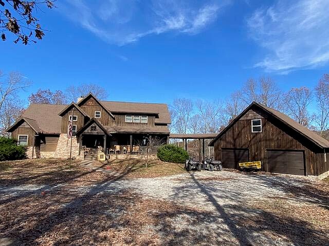 Beautifully poised on an Ozark hilltop over the Big Piney River where the eagles fly, this strong Craftsman home offers 3 bedrooms, 3.5 bathrooms, a custom kitchen with Viking Stove & vent, the regal stone fireplace (wood burning), a huge covered deck looking over the Big Piney, and an open floor plan with the master suite on the main floor. The Jack and Jill bedrooms are upstairs with a view of the huge wood beams and wooden ceiling from the loft/library. The Rec room/Family room is in the basement with the safe-room and walkout access via the concrete patio. Note the main floor wall of windows, wide pine plank wood floors, Jacuzzi tub & custom shower in the master, the covered breeze way connecting the home and spacious garage, ADT security, and so much more! Seclusion is yours, tucked in this 60+ acres of trees!