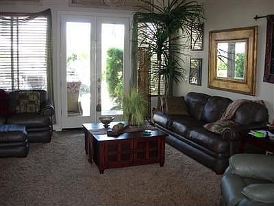 Just off the bluffs, this spectacular home is a hidden treasure. The private courtyard entry leads to the main entrance and inviting foyer. Custom lighting, over-sized tile floors, designer paint throughout. Great room has vaulted ceiling, gas fireplace, and French door access to the Nature pool, cascading waterfall, & patio area. The well equipped kitchen has center island work space, breakfast bar & casual dining area, lots of cabinets and counter area. An isolated bed room (potential den or office)is conveniently located at this end of the home, along with a nook for computer work station. The spacious master suite has a fabulous private bathroom w/large oval tub, stall shower, 2 separate, sinks & vanity area, along w/ 2 walk-in closets. Jack/Jill bathrm accommodates 2 of the guest bedrms. Extra large utility room has sink & leads to either single garage or double garage. A wonderful Casitas (guest quarters, 5th bedroom or home office) w/separate entrance sits in front area of home.
