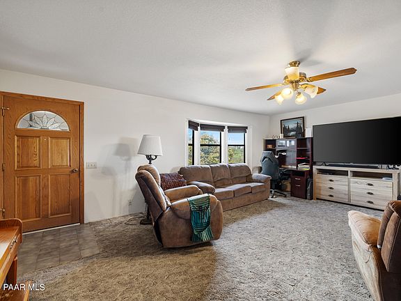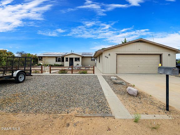 Welcome home! Country living, critter friendly property over 2 acres with an amazing view! 2 bed split floor plan with 1 3/4 bath inside and 3/4 bath in the 2 car garage. 2 car garage have shop/craft room. Solar will be paid at close of escrow! Fruit trees! Wood Buring fireplace, central heat and air, large laundry room with additional fridge conveys! Paid solar, local co-op water company! 20 minutes to Downtown Prescott.