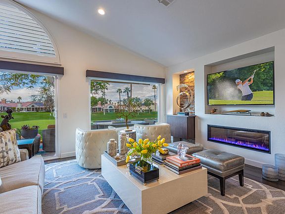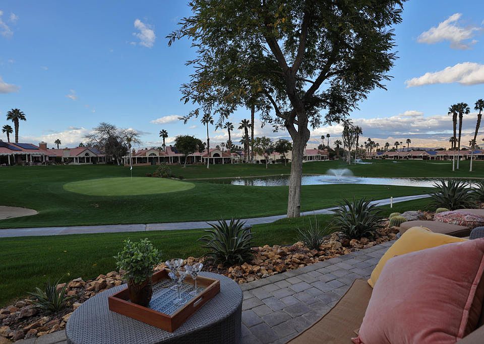 Welcome to 76906 Ascalon located in Oasis Country Club. This home sits on the 14th hole and boasts beautiful mountain views and spectacular sunsets, accentuated by a recent complete remodel featuring high-end finishes. The spacious living room welcomes with soaring ceilings, built-in cabinetry adorned with stacked stone finishes, and an electric flat-surface fireplace for cozy evenings. Oversized picture windows with custom coverings allow you to take in all the views. The kitchen is a chef's dream, fully remodeled with new appliances including a wine refrigerator and adorned with granite countertops. Gas cooktop with custom vent hood, recessed lighting, and custom corner cabinets. The two master suits are spacious with fully remodeled bathrooms and walk in closets. The garage has built in cabinets with a finished floor, and a dedicated A/C unit, and easily holds two full size vehicles. The additional golf cart garage is fully covered with alumawood and enclosed with custom iron doors. For optimal comfort, a new 4-ton A/C heat pump unit was installed in July 2023, with a 10-year transferable warranty, ensuring peace of mind. The Country Club offers golf, pickleball and tennis memberships. There are 18 pools and spas to choose from, fitness room, putting green and a renowned 18 hole executive golf course. The clubhouse offers casual dining in the Grill Room, and a lounge in the main dining room, a lending library, card room, and pro shop.