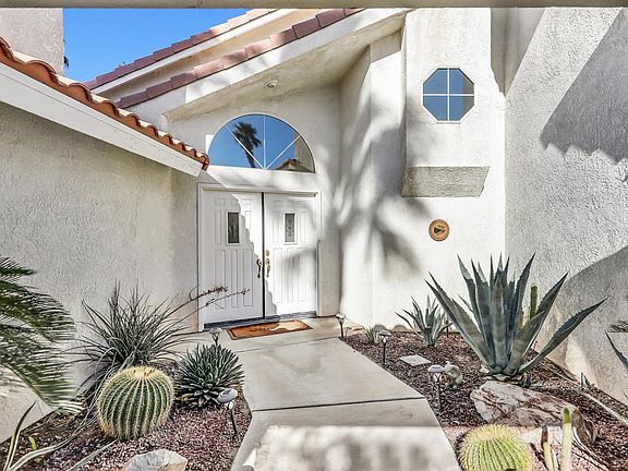It will be hard to find this gem in Palm Desert at this price, in the gated community of Regency Estates. Rarely do you find a home in this community with 5 bedrooms and 4.5 baths with 3 en suite; one downstairs in the primary bedroom, second en suite in the upstairs bedroom, and the third en suite downstairs in the bedroom turned into an office, and with 3,900+ square feet of living space, this home is the one to put an elegant touch to a bit of a fixer. Inside, be wowed by the grand entry into the massive great room with living room, dining area, vaulted ceiling and wet bar to entertain, and there are views of the outdoor grounds from the great room. Enjoy everything this home has to offer with the grounds of 13,000+ square feet with pool and spa, as well as several fruit trees, and a mature cactus garden to finish this spacious and beautiful outdoor area to grace this Palm Desert home. From the great room flow into the kitchen, eat-in-kitchen and family room with a gas fireplace and built in cabinets. The home chef will relish cooking on a gas stove with five burners in the kitchen. The primary bedroom is on the first floor off the great room, inviting and calming with a generous bathroom. The office (or second bedroom) is past the family room with a built-in desk, cabinets, and it is en suite. The three remaining bedrooms are upstairs with the last en suite bedroom and the two other bedrooms share a hall bathroom. Also, upstairs is a hall closet with a convenient laundry