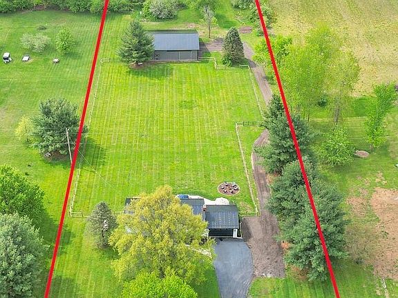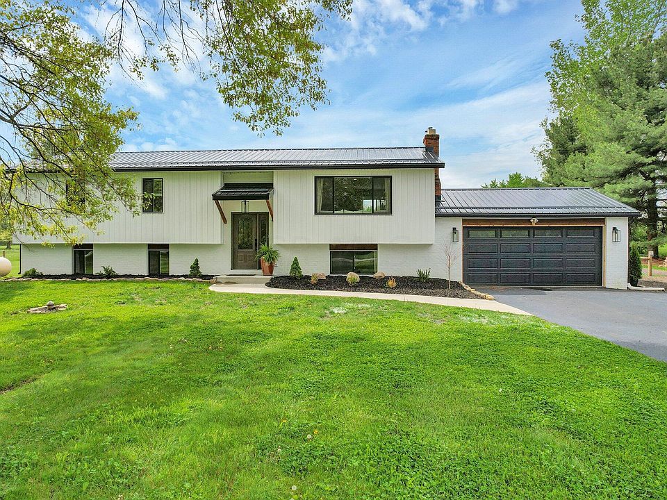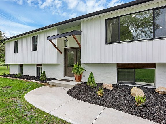 Welcome to your everyday getaway on 5.38 acres on a scenic country road! Curb appeal & completely remodeled home w/new composite deck & patio overlooking the huge fenced backyard, firepit, mature woods (w/walking trails) & 3,240 sf pole barn! You will love the open great room concept with wall of windows & fireplace which opens to the spacious kitchen featuring a huge island w/breakfast bar, granite, s.s. appliances, custom range hood & eating space with views! Fantastic owner's suite w/barn doors, walk-in closet & shower, dual sinks, soaker tub and a private deck! Den/office (or 4th br) plus a big rec rm in finished lower level. Bright & cheery home w/white trim & doors throughout! Pellet stove. Finished/heated garage! Huge pole building with water & electric for all the toys and storage!
