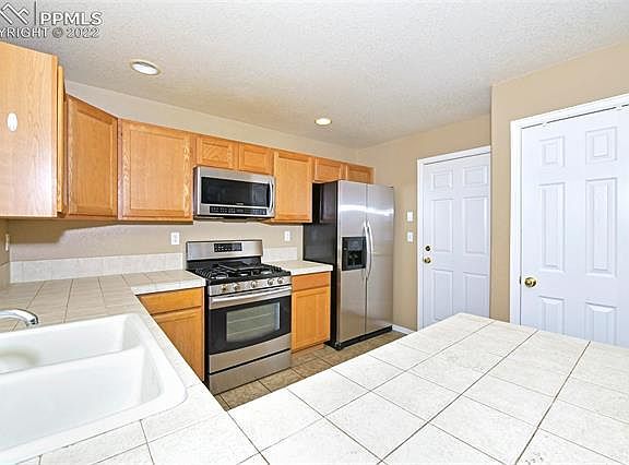 Lovely home, on Colorado Springs' east side, with 3 bedrooms, 2.5 bathrooms, 2-car garage and Central Air. The homes' main level has a spacious living room with plenty of windows, a built-in entertainment center, and a gas fireplace. The living room flows into the dining area and kitchen. The kitchen has stainless steel appliances, tile flooring, tiled countertops, and a kitchen pantry. A half bath is also found on this level. Access the wood deck off the dining area. The upstairs oversized Master suite is complete with an attached 5-pc bathroom, a walk-in closet, and tons of natural light. Across the hall are the 2 remaining bedrooms that share a full bathroom at the end of the hallway. The walk out basement is unfinished and houses the laundry hookups. The home's location grants you easy access to Marksheffel Rd. and Powers Blvd. and is near Laura Gilpin park along with shopping and dining amenities. Come and check this one out!