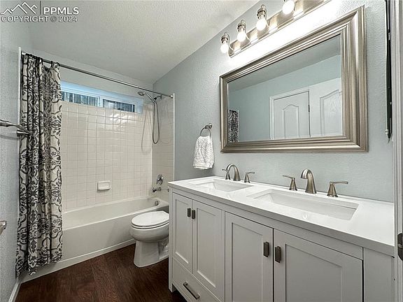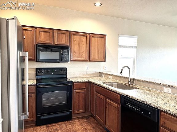Meticulously kept, updated, 4 bed 3 bath with an extra large oversized two car garage in Eastview Estates! Bright and open concept with beautiful life proof wood laminate flooring. Large kitchen complete with granite counter tops, pantry, breakfast bar seating, farmers sink, and walk out to a freshly stained deck. Down the hall from the living area is the office/work out room/bedroom with French doors, half bath, and great sized master suite (15x14) boasting vaulted ceilings, walk in closet and attached master bath. The lower level is spacious and open with 9 ft ceilings huge laundry room and storage area. Two good sized additional bedrooms and a full bath. Newer appliances and new roof. Close to shopping, Peterson, Carson, Schools, and a park/open space less than a block away!!