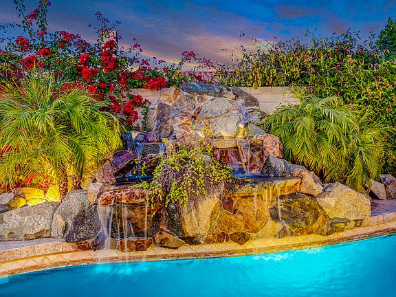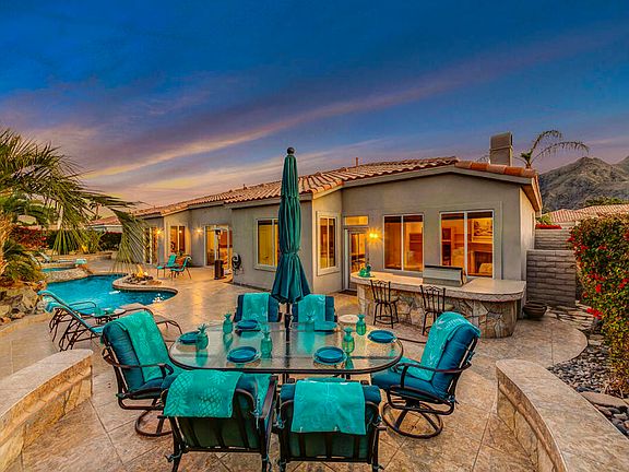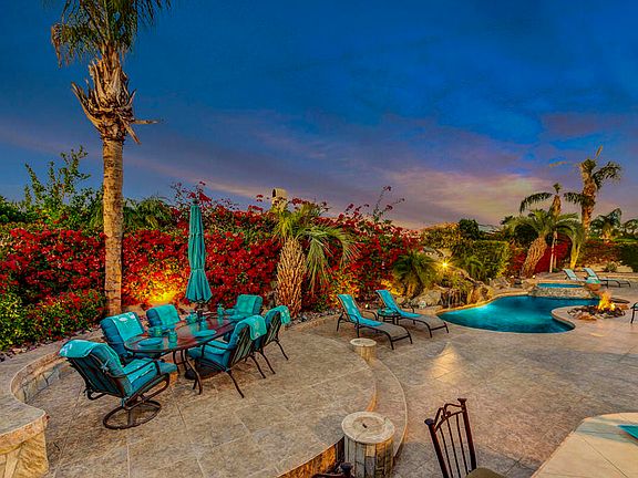 Entertaining is a breeze, with the outdoor built-in BBQ, generous areas for lounging, dining & basking in the sun. Enter this 2746 sq. ft. of single level living space, with formal dining, living great room, with wall to wall glass windows directing your eyes to the outdoor spaces. Inside Indian Wells, Country Club your Desert Retreat awaits! An opportunity to indulge in some of life's finer pleasures! Enjoy magical purple & orange sunsets from your private, ceramic Italian hand laid, tile courtyards. Mountain Views with a serene, cascading rock waterfall, invites you to soak in the pool & relax in your Jacuzzi, after a round of golf or tennis match or, if you prefer, cozy up to the lava rock fire pit. This gorgeous home is made for some of life's fullest enjoyments! Low maintenance landscaping makes for a perfect second home or enjoy the desert full-time. The large primary suite with a large soaking tub, spacious custom tile shower with beveled glass & huge walk in closet. Perfectly designed split floor plan with primary suite at one side of the home & 2 generously sized bedrooms on the opposite side allowing for complete privacy. Kitchen is equipped with newer appliances & kitchen cabinets for the chef in you. Breakfast, nook & pantry, open up to a relaxing, informal family room. Complete with two car carpeted garage, plus golf cart garage & plenty of storage space. Newer HVAC / Units. Immaculate home feels fresh and vibrant!