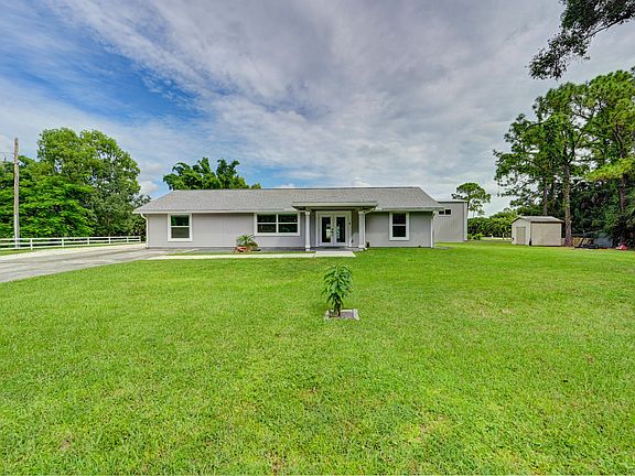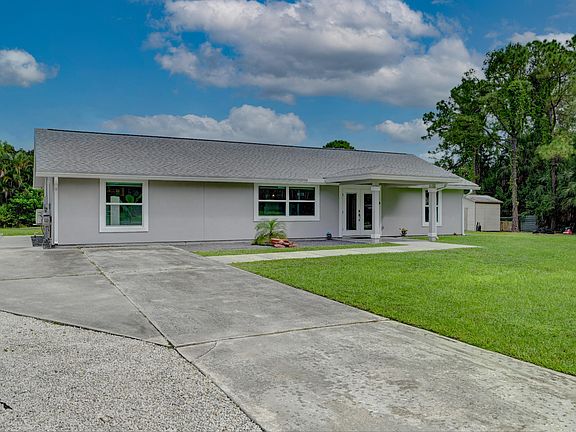 TOYS TOYS TOYS, if you have toys you will not want to miss this home on over an acre in Palm Beach Country Estates. Featuring a Huge toy house, A 40x60' Red Steel Hurricane strength building sits with open doors waiting for your RV/ Boat. Drive thru 14' Doors with an 8' Door on the other side. Building was designed tall enough for the biggest boat or bus and the other side has footings that will support a second floor. Hurricane windows and skylights in the roof provide tons of natural light. Almost new, the house is a 3/2 Huge open floor plan with a separate office. Step into a 28x24 foot living dining and kitchen area. A giant island highlights the kitchen. White quartz on white cabinets really set this kitchen off. Watch the video in the listing.